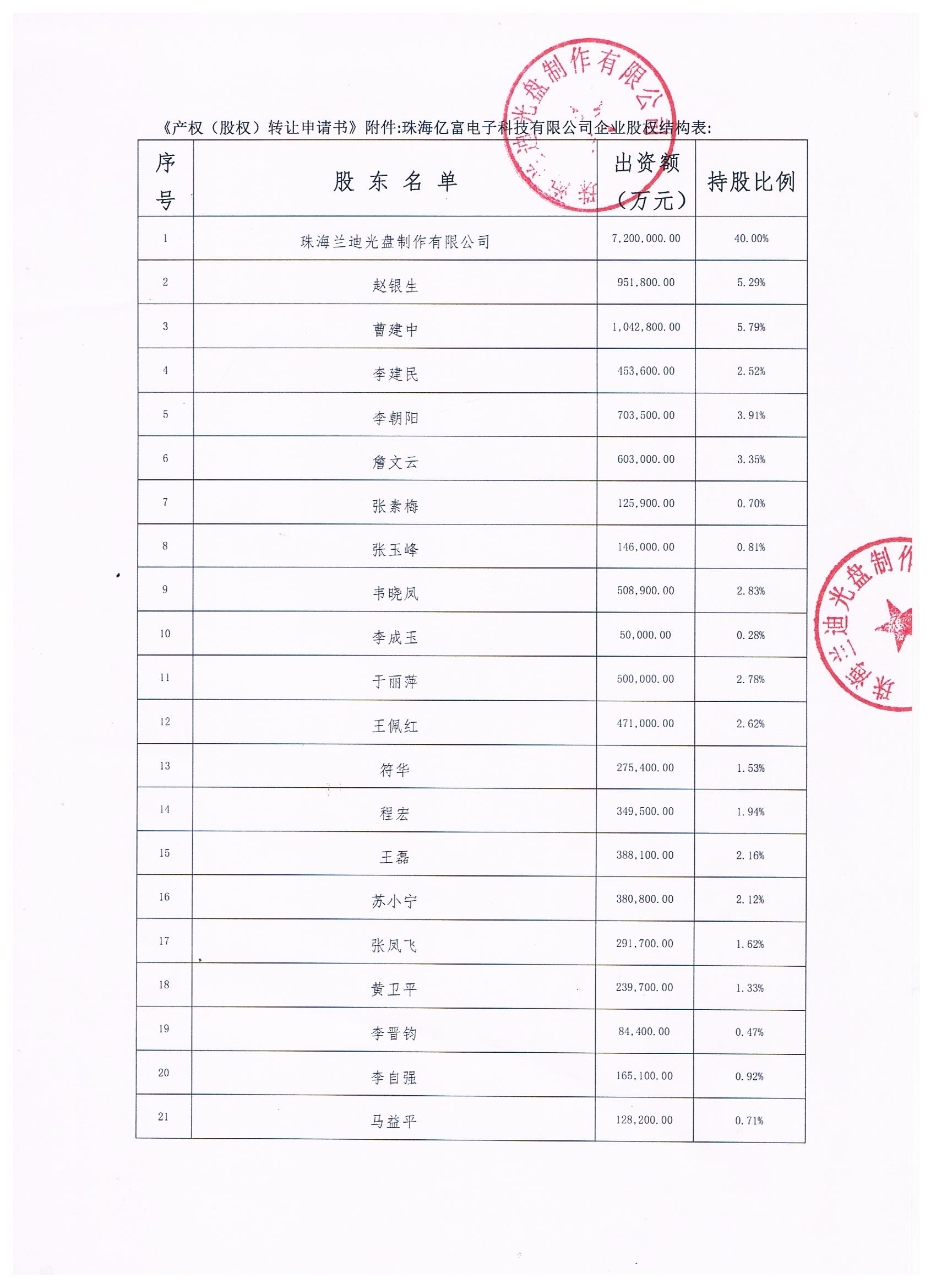 附件资料 公示附件 附件:珠海亿富电子科技有限公司企业股权结构表-1.jpg 、 附件:珠海亿富电子科技有限公司企业股权结构表-2.jpg 、 受让申请书(产权及资产类)-多次报价-无优先权.doc 、 产权交易合同-范本.pdf 材料附件 -